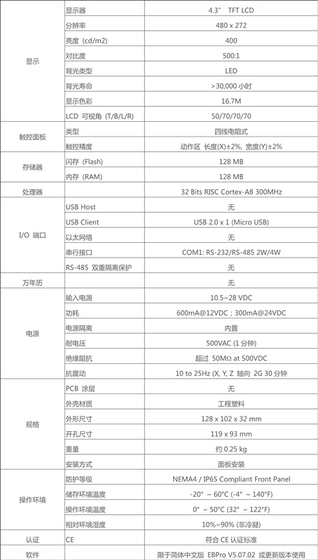 4.3" 480x272 TFT LCD, LED 背光燈